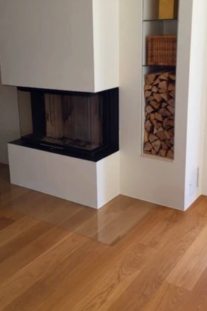 mit Treppenbau und integrierter Glasplatte um Ofen